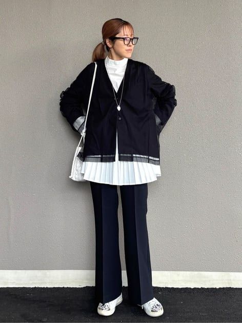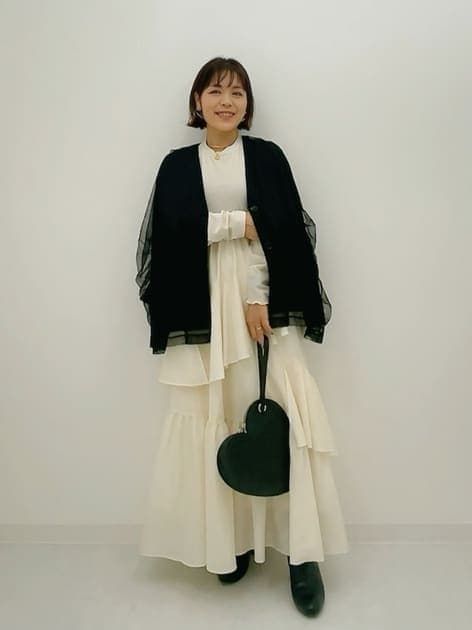 認定スタイリスト:押野真規子(身長160cm)「セットアップ風にスタイリング。長めの丈を合わせると裾のチュールが際立って可愛い♡この時裾はストレートカットのものと合わせるのがおすすめ。ボトムスはフレアめなパンツを合わせるのが今見えしそうです。」