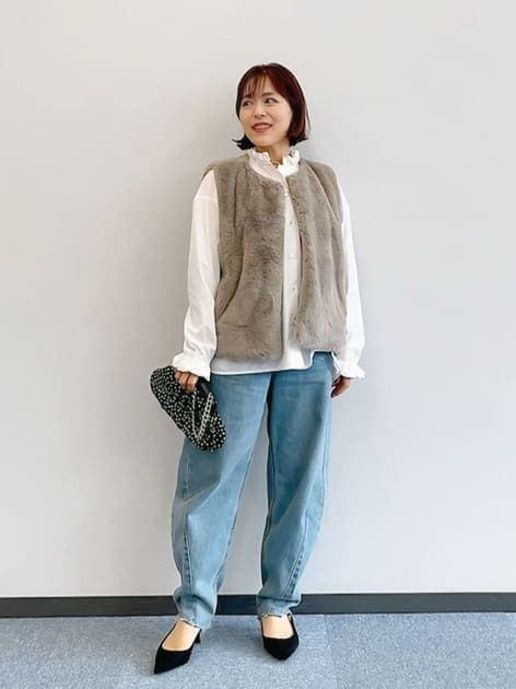 認定スタイリスト:YUKIE(身長149cm)「襟のフリルがアクセントになっているシャツをインナーに入れてジレを羽織れば、上品なデニムカジュアルが完成します。」