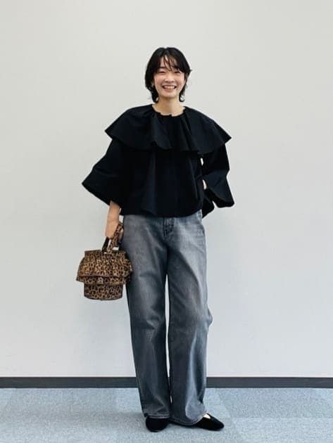 認定スタイリスト:naomi(身長165cm)「ゆるっとしたグレーデニムを合わせて抜け感を。小物はレオパード柄バッグでアクセントをつけて大人っぽくまとめました。子どもの習い事の送迎時などにおすすめ。華やかフリルで、ママ友ランチにもぴったりです。」