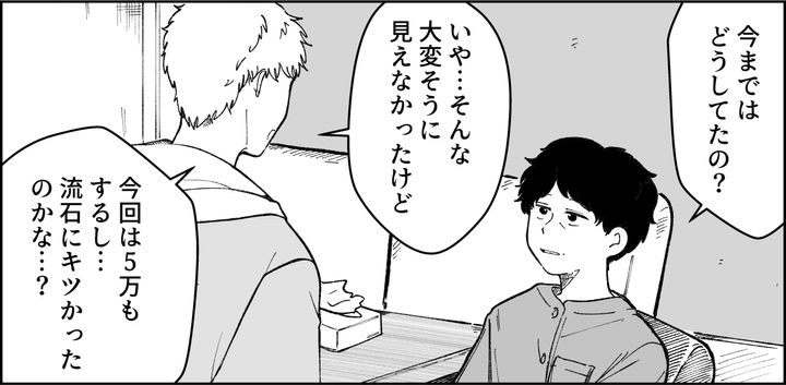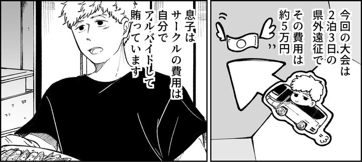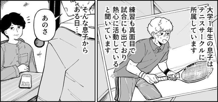 私は50代のアスカ。息子のタイチは大学1年生で日々キャンパスライフを楽しんでいます。高校でテニス部だった息子は、大学でも好きなテニスを続けたくて学内のサークルに入りました。伝統あるサークルで実力者も多く、大会に出るなど熱心に活動しているそうです。息子とはあらかじめ話し合い、サークルにかかるお金はバイト代から出してもらうことになっています。そんなある日、息子がサークル仲間のユウジくんについて相談してきました。
