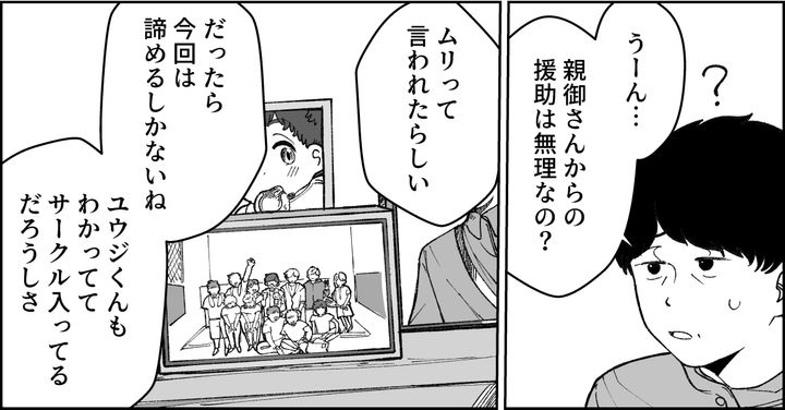 もちろんサークルに入る前にお金のことは説明されていたはずです。出せないのなら今回の遠征は諦めるしかありません。しかしユウジくんはサークル仲間の同級生に「自分も参加したいからカンパしてくれ」と言い出したらしく……。
