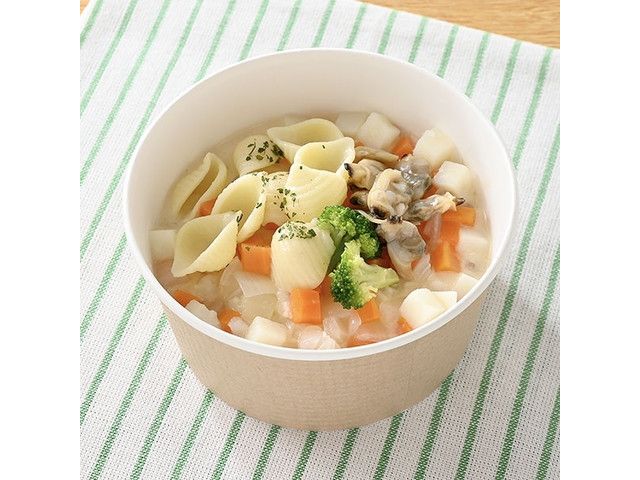 濃厚なあさりの旨みに加えて、生クリームのコクや野菜の風味をきかせたクラムチャウダーです。具材には、あさり・ポテト・野菜にシェルマカロニを使用し、ボリューム感のある仕立てです。