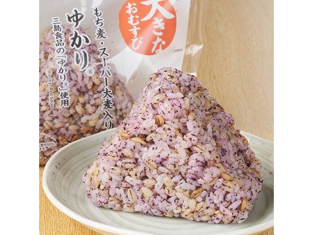 食物繊維が豊富なスーパー大麦ともち麦入りのごはんに「三島食品」の「ゆかり®」を混ぜ込みました。ボリュームタイプのおむすびです。 ※宮崎県、鹿児島県では取り扱いがございません。