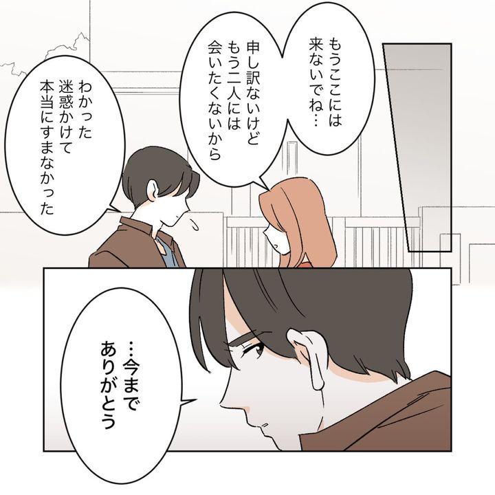 話し合いが終わると、カエデはワタルに「もうここには来ないでね・・・申し訳ないけどもう2人には会いたくないから」と言いました。ワタルは「迷惑かけて本当にすまなかった・・・今までありがとう」と言い、カエデに背を向けて去っていきました。