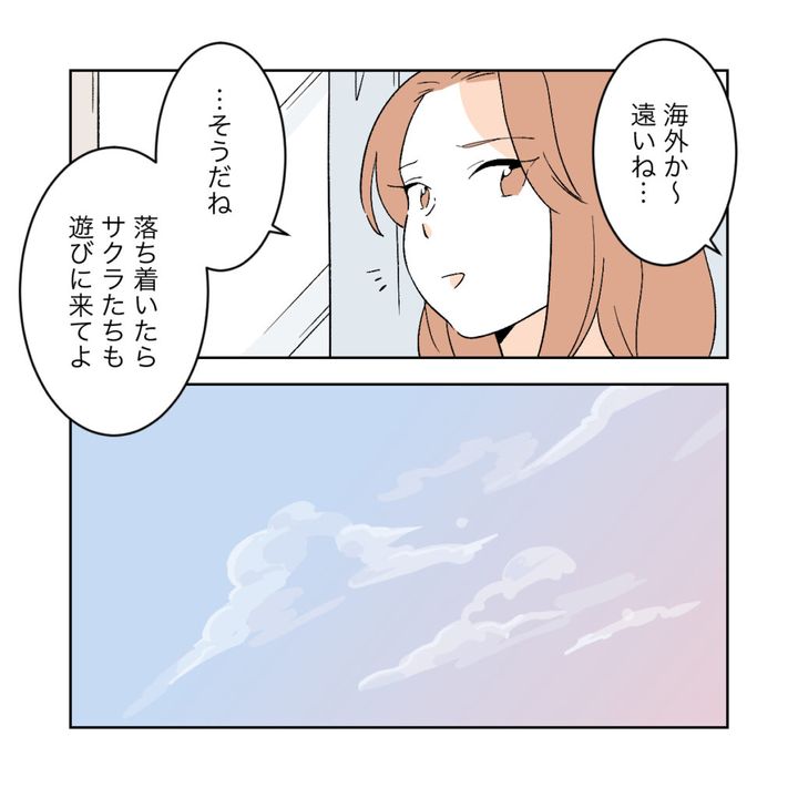 「海外か~遠いね・・・」寂しそうに言うサクラに、カエデは「・・・そうだね、落ち着いたらサクラたちも遊びに来てよ」と言いました。窓の外には、澄み切った夕暮れの空が、カエデの新たな門出を照らすように広がっていました。