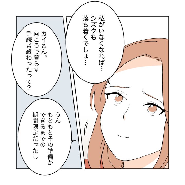 カエデは吹っ切れたような顔で、「私がいなくなればシズクも落ち着くでしょ」と言いました。実は、カエデが地元に戻ってきていたのは、夫のカイとアカネの3人で海外に移住する手続きをするためでした。カイが手続きを整え次第、地元を離れることになっていたのです。