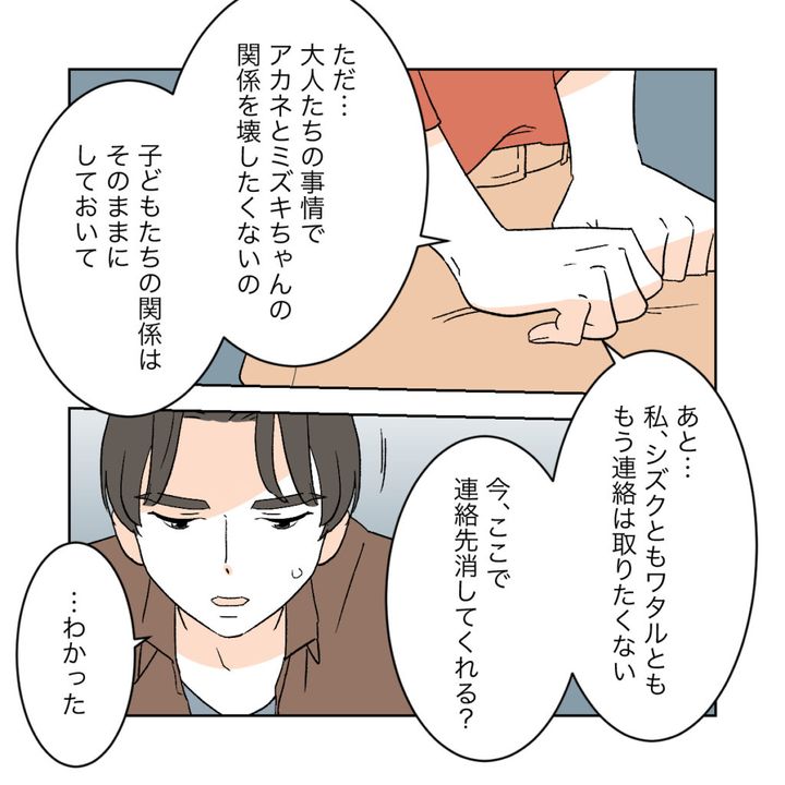カエデとシズクの関係は悪くなってしまいましたが、彼女たちの子どもであるアカネとミズキは変わらず仲の良い友達同士です。大人たちの事情で2人の関係を壊したくないと思ったカエデは、子どもたちの関係はそのままにしておいてほしいとワタルに頼みました。