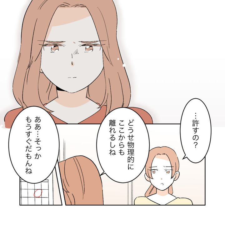 シズクがサクラとアカネしたことは許されない行為だったと申し訳なさそうに謝罪するワタル。カエデは、今後自分たちに関わらないことを条件に、シズクがした行為を許すことにしました。話し合いが終わり「もうここには来ないでね・・・申し訳ないけどもう2人には会いたくないから」と言うカエデに、ワタルは「迷惑かけて本当にすまなかった・・・今までありがとう」と言い、去っていきました。大切な幼馴染を失ったからなのか、それとも高校時代の切ない記憶を思い出したからなのか、カエデは胸が締め付けられるような気持ちになりました。一連の話を聞いていたサクラが「許すの?」と聞くと、カエデは「どうせ物理的にここからも離れるしね」と言いました。実は、カエデが地元に戻ってきていたのは、夫のカイとアカネの3人で海外に移住する手続きのためでした。カイが手続きを整え次第、地元を離れることになっていたのです。「海外か~遠いね・・・」寂しそうに言うサクラに、カエデは「落ち着いたらサクラたちも遊びに来てよ」と言いました。窓の外には、澄み切った夕暮れの空が、カエデの新たな門出を照らすように広がっていました。