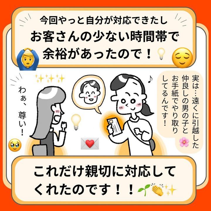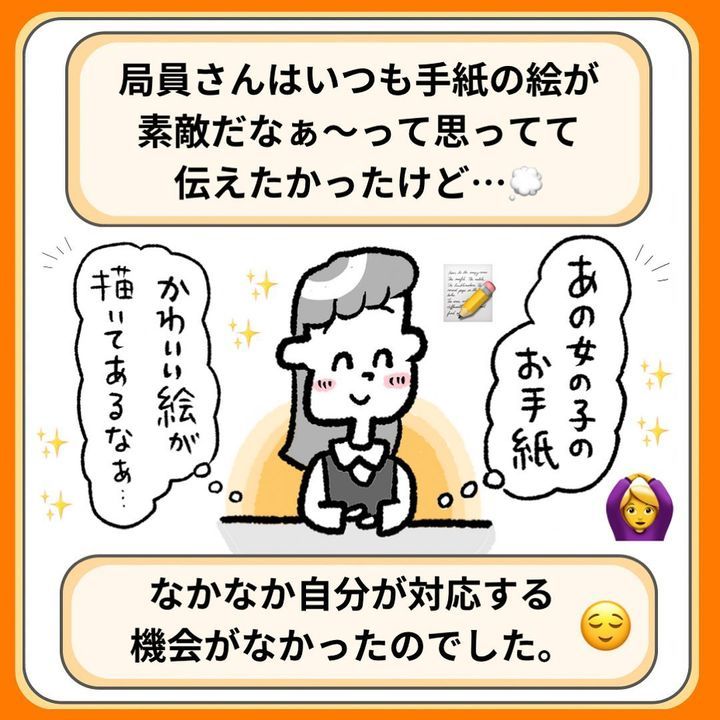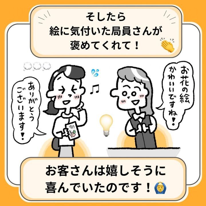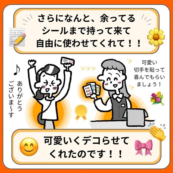 郵便局に切手を買いに来た学生客。持っていた手紙に描かれた花の絵が可愛らしく、郵便局員たちは、デコレーション用のシールやペンをプレゼントしたのでした。