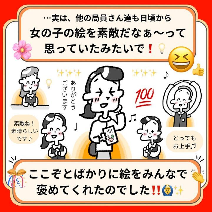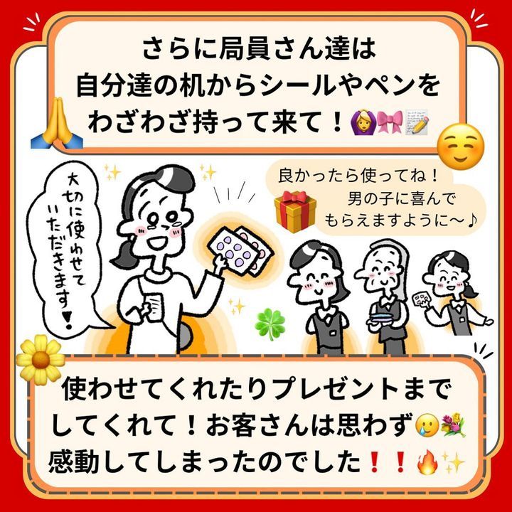 可愛い花の絵を褒めるだけでなく、デコレーション用のグッズをプレゼントする郵便局員たちの心の温かさが伝わってきました。「大切に使わせていただきます!」と、うれしそうに顔をほころばせる学生客の姿も印象的です。