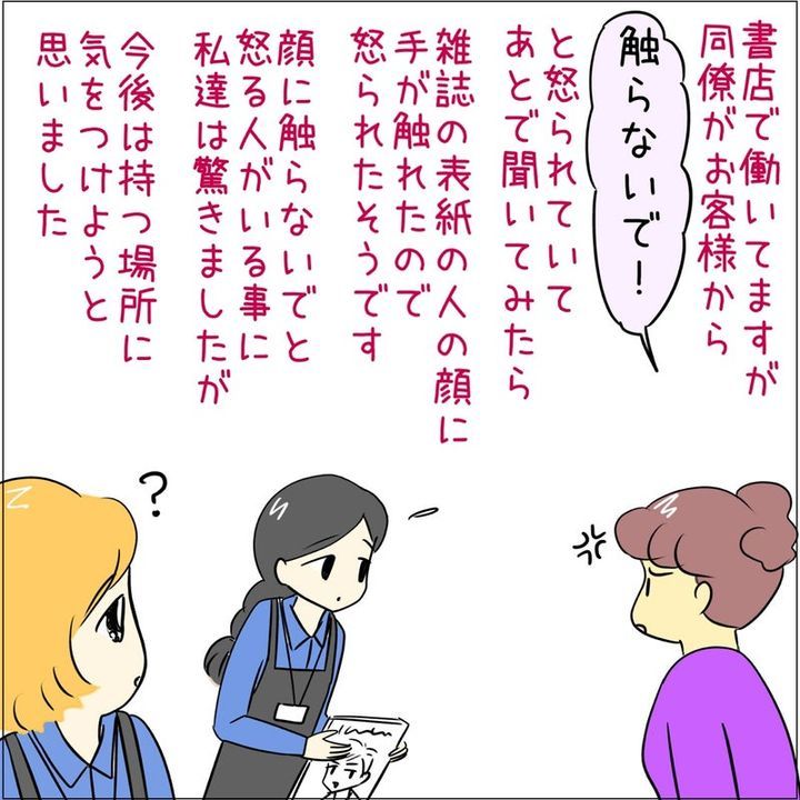 また、書店で長年レジを担当している人は、同僚がお客の買う雑誌を持っていたところ、「触らないで!」と怒られていたのだそう。あとで話を聞いてみると、その雑誌に印刷された人物の顔の部分に手が触れたことを咎められたのだそうです。