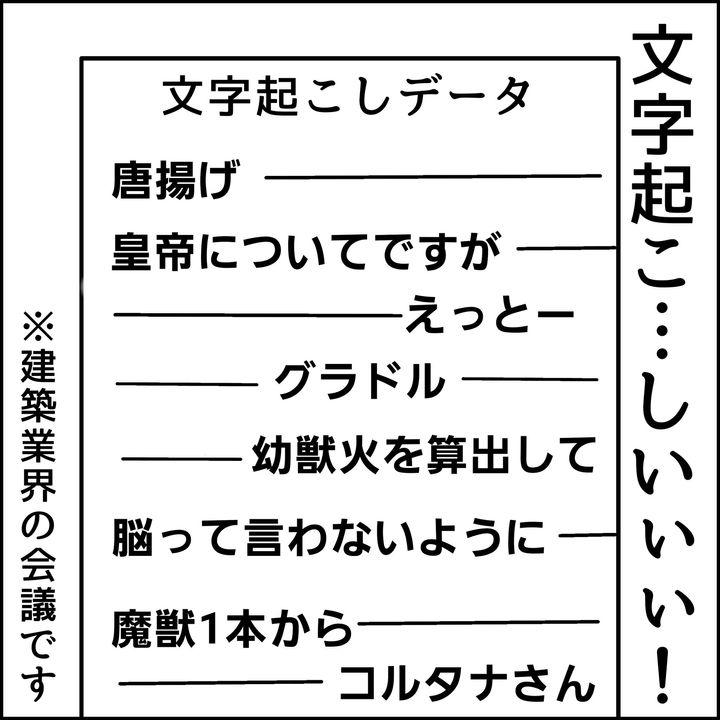 ところが、会議が終了したあとのパソコンに表示された文字起こしデータはひどいものでした。建築業界の会議にもかかわらず、「唐揚げ」「皇帝についてですが」「魔獣1本から」などのフレーズがぎっしり並んでいたのです!