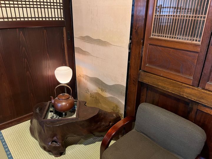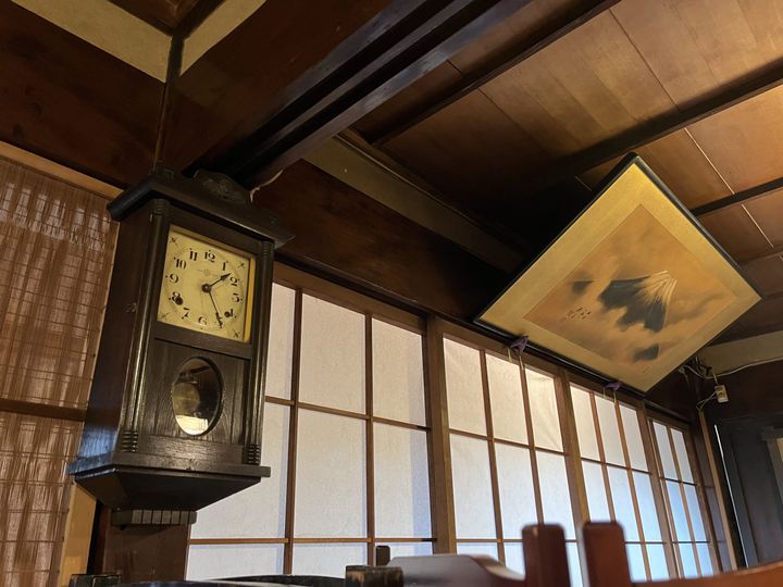 傍らにはいろりと急須が!和テーブル、衝立、天井と見るもの見るものが目新しく、1人でキョロキョロしてしまいます。カチコチと音がするので振り返ると、大きな掛け時計が。なんとも懐かしいです。父の実家にも、こんな時計がありました。