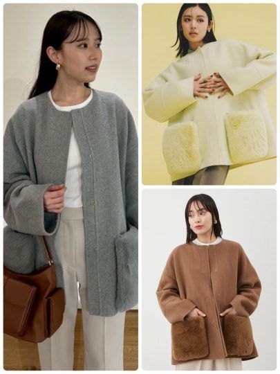 軽く、シンプルなノーカラーコートだから合わせやすさはトップクラス。もこもこのエコファーポケットは取り外せるので、ごくシンプルにまとめたい日も助かります。合わせやすいヒップが隠れる丈感で、ワンピもパンツスタイルもこれ1枚で対応。厚手のニットを着込んでも、もたつかないので真冬も大活躍しそう。