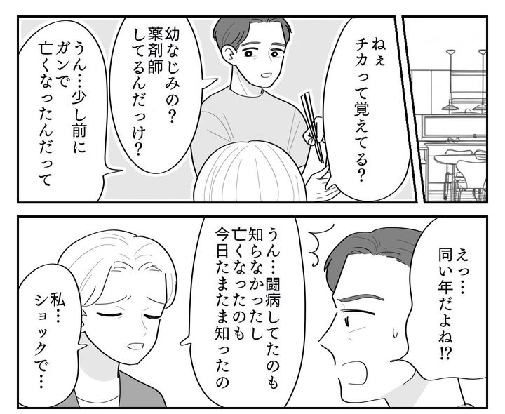 私(ミドリ)は50代。子どもたちは巣立って。現在は夫と2人暮らしをしています。私は生まれ育った町でずっと暮らし、幼なじみのチカと長い付き合いをしてきました。チカは薬剤師で、数年前にお父さんが亡くなったあと実家の薬局を継ぎました。この1年ほどは連絡を取り合っていなかったのですが……。なんと先日、チカが亡くなっていたことを人づてに知りました。家族葬ですでにお別れの場も終わっているとのこと。私は呆然としたのでした。