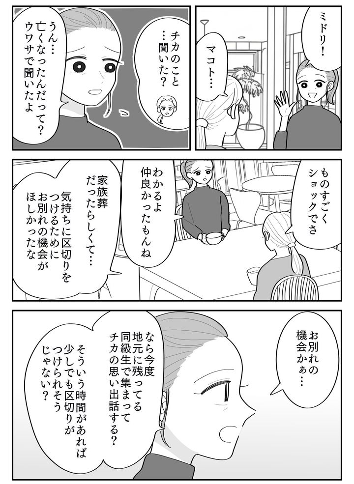 大切な人を亡くした悲しみはひとりで抱え込めるものじゃありません。人と分かち合うことで癒えていくこともあるでしょう。同級生のマコトが「仲間内で集まってチカを偲ぶのはどうか」と提案をしてくれたことは、とてもありがたかったです。自分なりに区切りをつける機会が必要なのかもしれませんね。