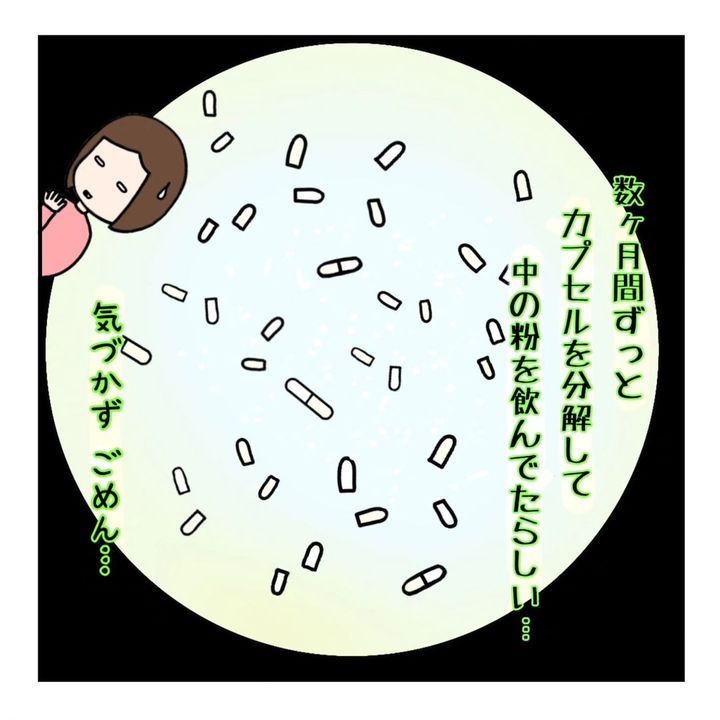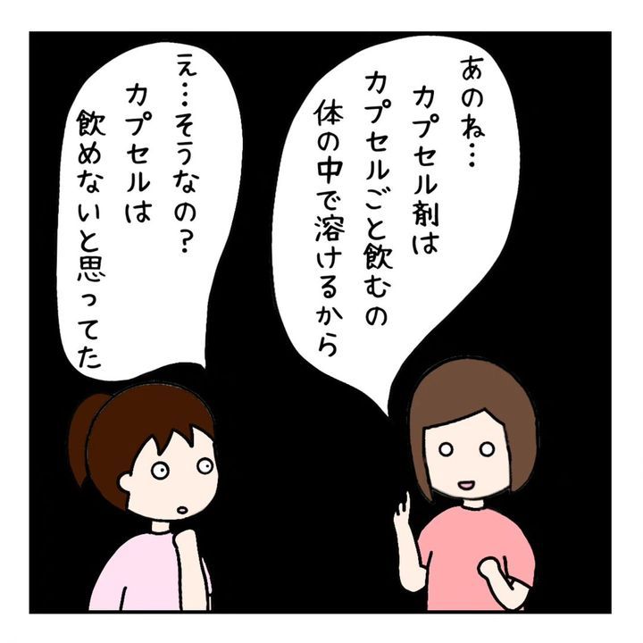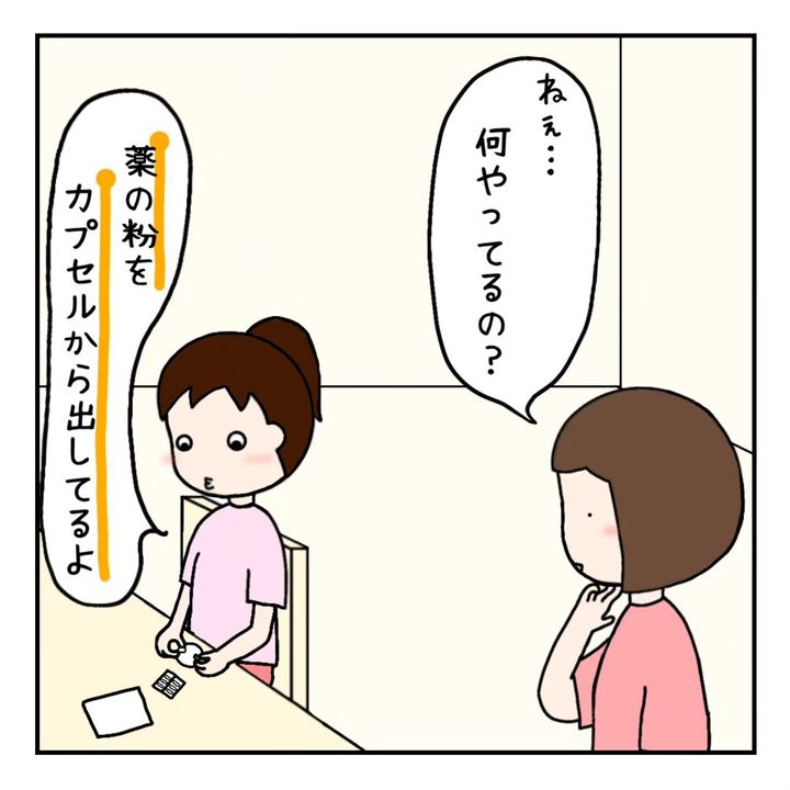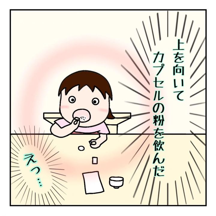 もともと粉薬が処方されていたようですが、年齢が上がったからか、カプセル剤に変わったそう。ある日のこと、テーブルの上に“カプセルの抜け殻”を発見!なんとせなちゃんは、カプセルを分解し、中から粉薬を取り出して飲んでいたようです。びっくりしたkomorebi_kirariさんは「カプセルごと飲むの、体の中で溶けるから」と説明。「言われないと分からないよ」と、口をとがらせるせなちゃんでした…。