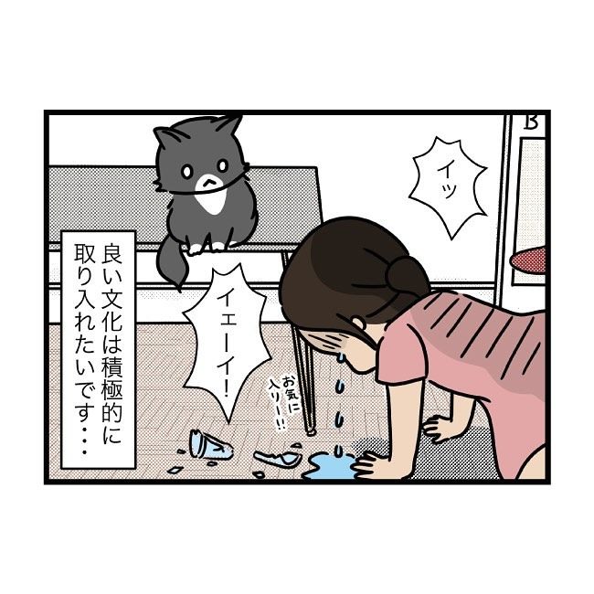 そんな中、自宅でベイリーちゃんにグラスを割られたNENEさん。とっても悲しいものの、なんとか「イッ」「イェーイ!」と、イギリス文化を取り入れようとするのでした。背中に哀愁が漂っています…。