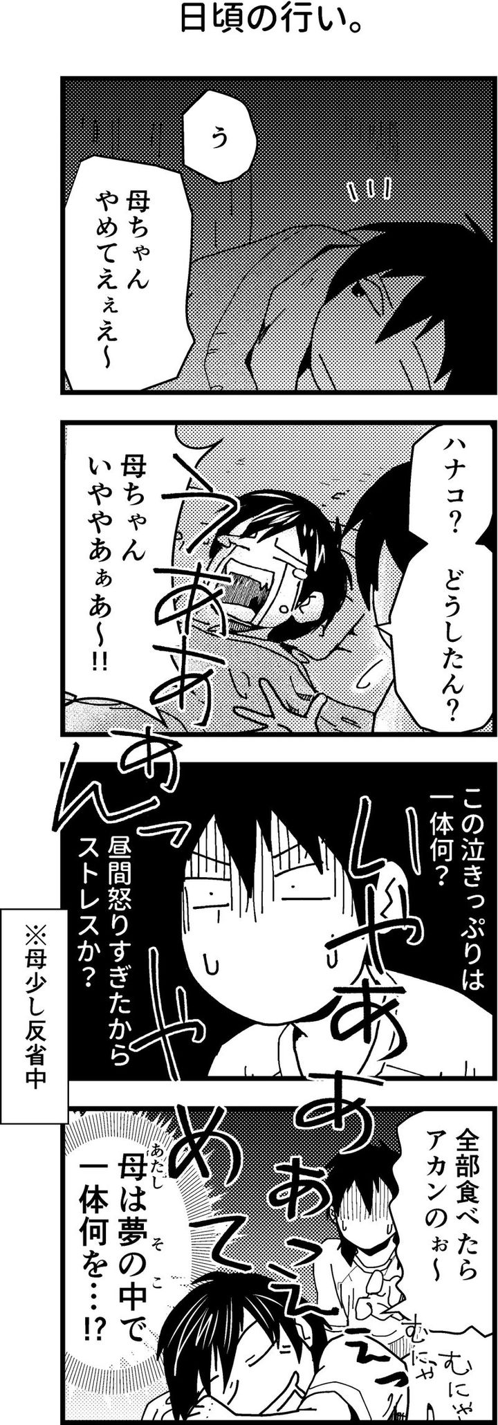 はるたけめぐみさんが寝ていると、隣から、「母ちゃんやめてえぇえ~」とハナコちゃん。寝言はそのままエスカレートしていき、泣き出してしまうほど。昼間に怒りすぎたかと反省していると、今度は「全部食べたらアカンのぉ~」と甘い声。夢の中で何が起こっているのかが気になって仕方がない、はるたけめぐみさんなのでした。