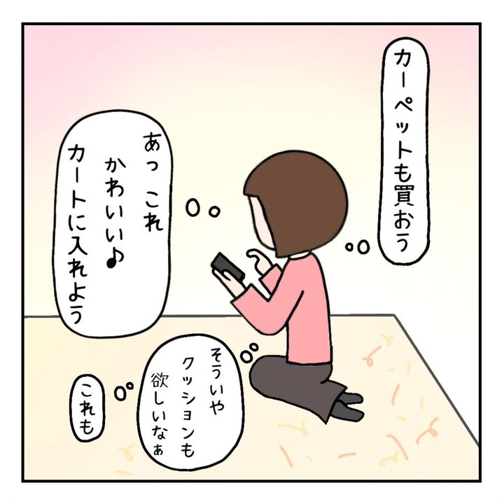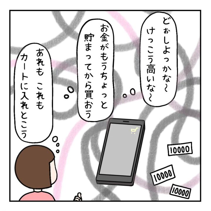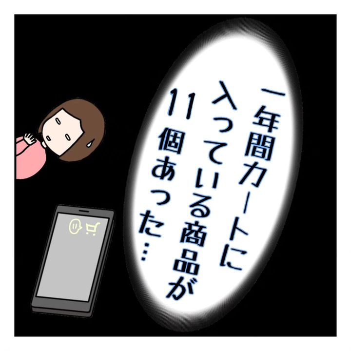 新しい食器をネットショップで購入することにしたkomorebi_kirariさん。カートに入れたものの、「お金がもうちょっと貯まってから買おうかな」と、一旦保留にします。その後も、カーペットやクッションをカートに入れ、結局、1年間カートに入っている商品が11個にまで増えたのでした。