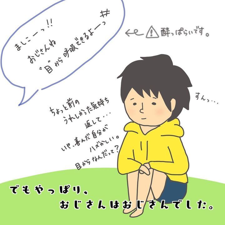 「うーん…よく笑うところかな。」と答えるおじさんさん。ふざけると思ったものの、さらりと答えられて照れてしまうましこさんなのでした。ちなみにその後、酔っ払ったおじさんさんにしっかり「おじさんね“目”から呼吸できるよーっ」とおふざけをされたようですよ!