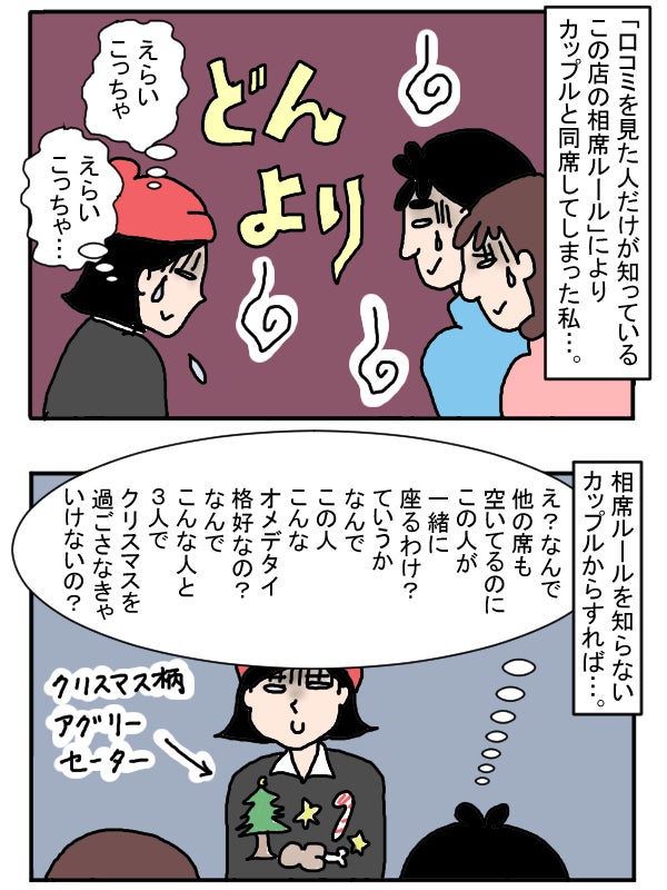 相席システムのことを知らなかったのか、2人から迷惑そうなオーラが漂います。カップルは盛り上がっていたようで、卓上には私物のクリスマスの置物が。ワンタケさんは恋人たちのムードを台無しにするような浮かれた柄のセーターを着ており、さらに肩身の狭い思いをします…。