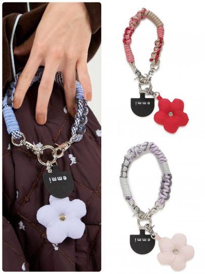 フラワーモチーフ、コード紐、ロゴプレートが融合。コード紐を3種類使い、絶妙な色合わせがポイントです。