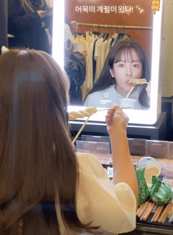 動画には、控え室でおでんをもぐもぐ食べているハン・ジミンの姿が映っている。お茶目な表情のままカメラと目が合った彼女は、鏡の照明も加わり眩しい美貌を放っている。一方で、おでんが美味しい季節の訪れを喜ぶ、飾らない魅力も印象的だ。