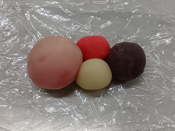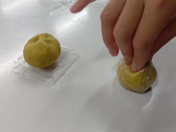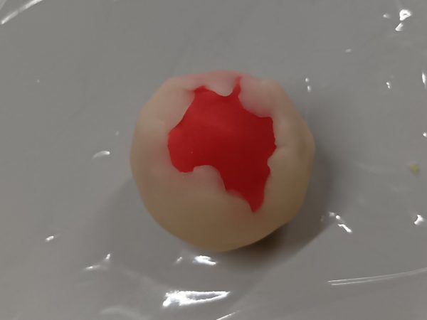 そして紅の練り玉を包みます。白あんの生地を伸ばしながら包むのはなかなか難しい! それでも子どもは粘土遊びみたいと楽しんでいました(笑)