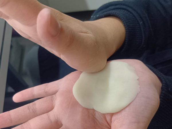 最初に白あんの練り玉を平らに伸ばします。餃子の皮ではありません(笑)