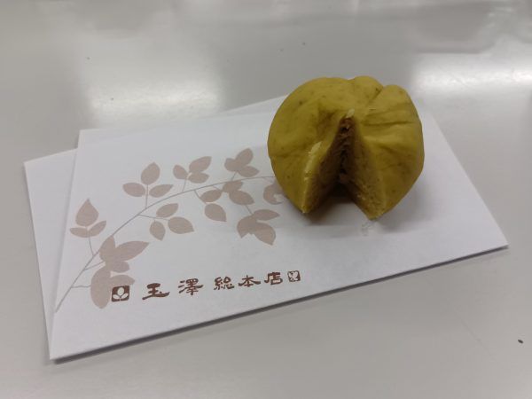 こちらはお土産にいただいた「紅葉」をイメージした金団。 デモンストレーションを見ましたが、一つひとつ手作業で美しく仕上げるプロの技に見惚れてしまいました。工場でも毎日5種類ほどの品をそれぞれ150個前後、手作業でつくるというから驚きです。