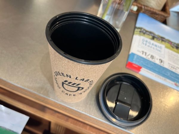 外装がコルク素材で手触りが柔らかく、見た目にも温かみがあります。保温性もありそうで、これからの季節にぴったりです。さらにイベント期間中は、購入者にワンドリンクチケットが付いてくるのでお得感もあります。
