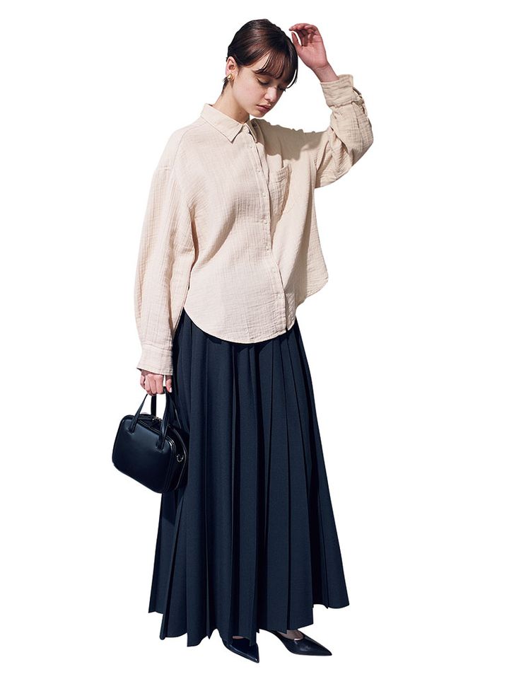 肌あたりがいいうえ、すでにそなわったシワ加工により手入れもラクな1枚。左胸のポケットが、そでまでゆったりとした形のぼやけを防ぐさりげないアクセントに。穏やかな品がそなわる、薄づきのベージュは重たく見えずいまの季節にもぴったり。