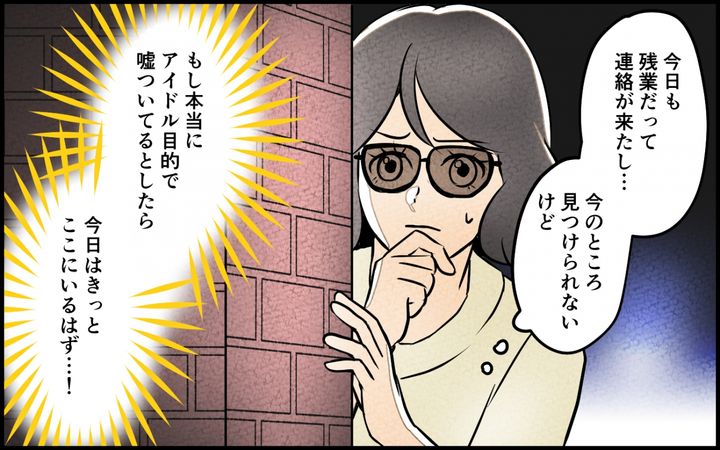 夫を疑ってモヤモヤしている毎日は苦しいだけ。ハッキリさせたい。夫を尾行するような真似に抵抗はありましたが、友人に背中を押してもらい、何もなければ笑い話になるだけだと自分に言い聞かせてライブに潜入したところ…。