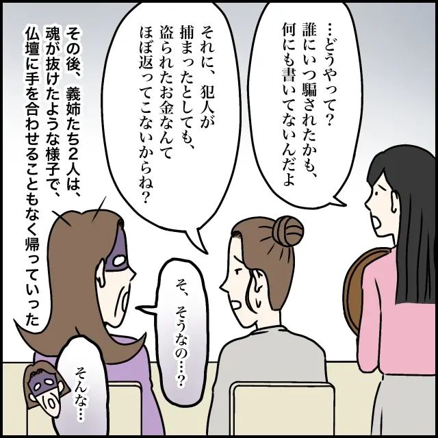吉美さんの提案に「どうやって?誰にいつ騙されたかも、何にも書いてないんだよ」と聞く涼子。続けてひろみちゃんも「犯人が捕まったとしても、盗られたお金なんてほぼ返ってこないからね?」と現実を突き付けます。その言葉を聞いた義姉たちは、魂が抜けたような様子で、仏壇に手を合わせることもなく帰っていきました。