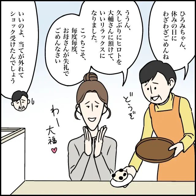 義姉たちが帰り、やっと平穏が戻った我が家。「休みの日にわざわざごめんね」私は少しばかりの感謝の気持ちに、ひろみちゃんに大福を出しました。ひろみちゃんは、わーいと喜びながら「久しぶりにヒロトを大輔さんに預けていいリラックスになりました、こっちこそ毎度毎度お母さんが失礼でごめんなさい」と申し訳なさそうに言いました。