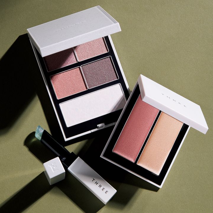 星とネオンをイメージ。上から:THREEホリデーコレクション パレット 2025 ¥8,250、同 シマリング グロー デュオ R ¥4,950、同 グリタリングジェリーリップ ¥4,290(THREE)