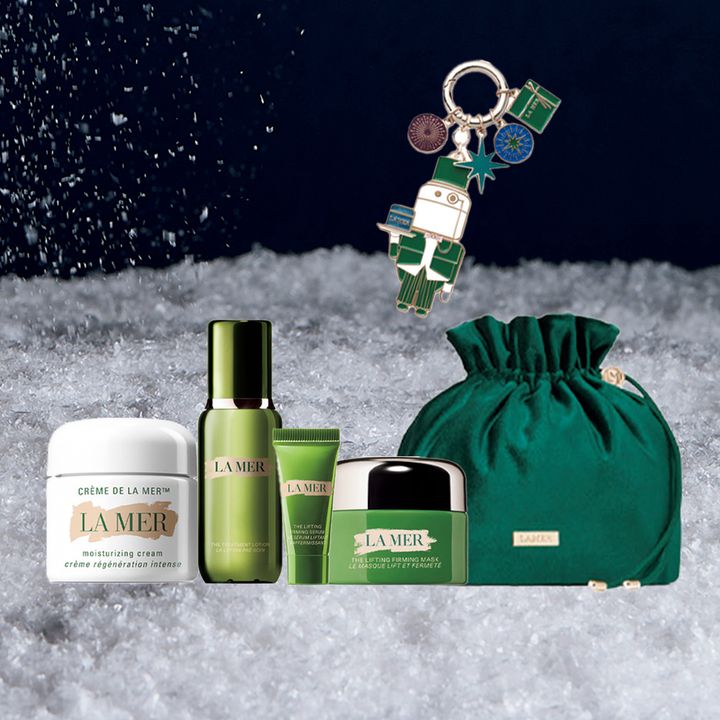 LA MERのアイコン的クリーム「クレーム ドゥ・ラ・メール」などのモイスチャライザーと、高機能化粧水の現品を1つずつ選ぶと、美容液とマスクのトライアルサイズがついてくる、名品を堪能できるプレミアムなコレクション。さらに巾着やチャームもセット。一年頑張った自分へのご褒美に最適のアイテム。ザ・ハイドレーティング ホリデー コレクション ¥81,400〜(ラ・メール)