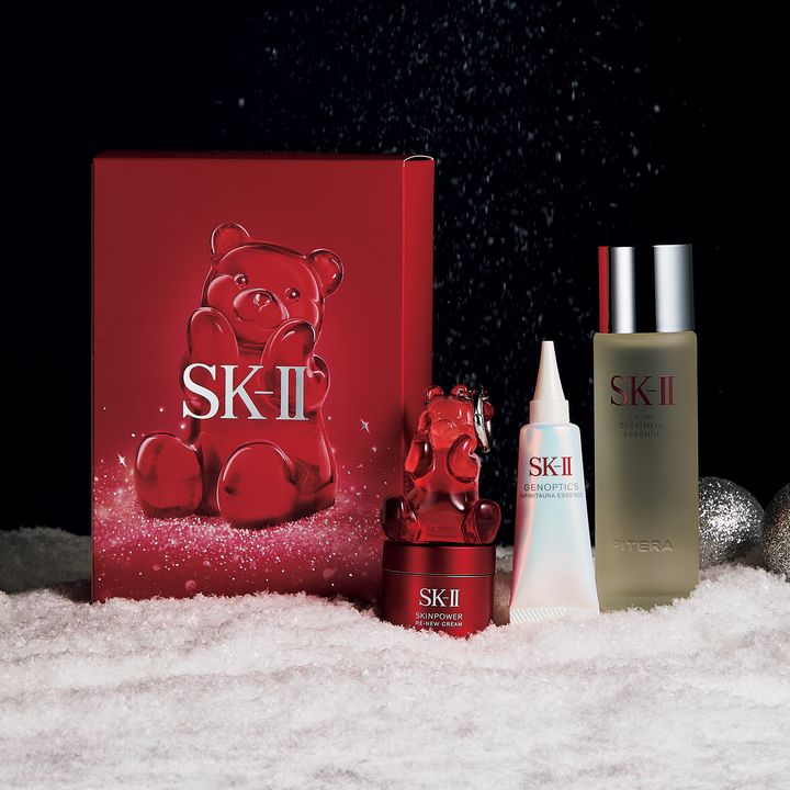 名品化粧水「フェイシャル トリートメント エッセンス」現品に、美白美容液と新作「スキンパワー リニュー クリーム」のミニサイズをセット。ライン使いで透明感のある素肌に導いてくれる信頼のコフレ。今年はSK-II初のオリジナルキャラクター「ぴてくま」のチャーム付き!キュートな赤いベアと一緒にホリデーのスキンケアを楽しんで。SK-II ピテラ™️ ベストコレクション 2025 ホリデーコレクション ¥13,970〈編集部調べ〉(SK-II)