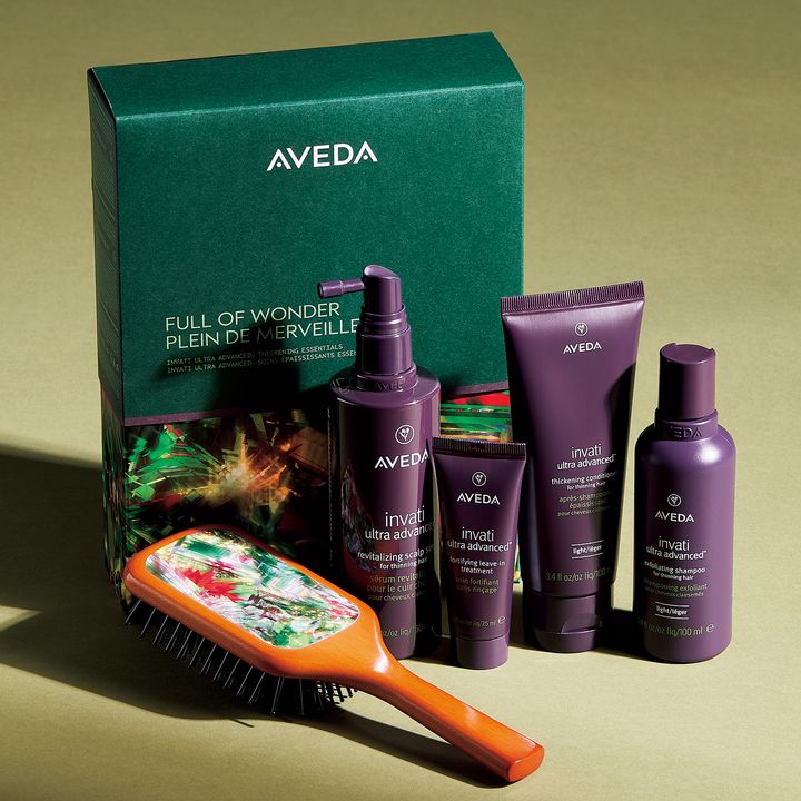 左から:限定デザインブラシ。ホリデー エクスクルーシブデザイン ミニ パドル ブラシ ¥4,400、ハリコシのある髪が叶う4品。インヴァティ ウルトラ アドバンス エッセンシャル ギフト ¥14,300 (アヴェダ)