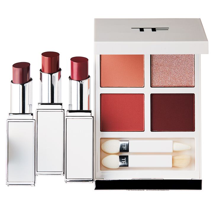 左から:アルプスの空に着想した3色。立体的な唇に。ウルトラ シャイン リップ カラー 03 02 01 各¥8,250、マット質感を中心とした限定色。ソレイユ アイ カラー クォード 01SN ¥13,640(トム フォード ビューティ)