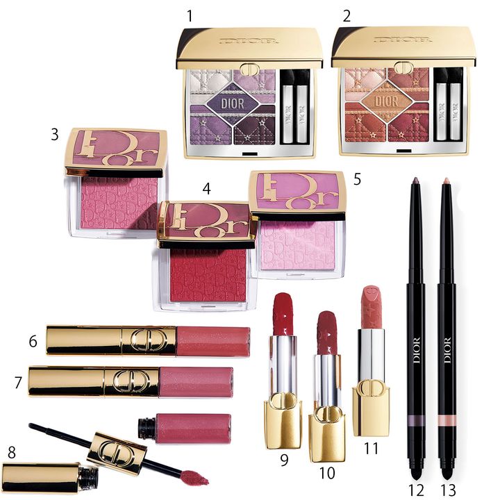 1.2:ディオールショウ サンク クルール 912、636 各¥10,010、3.4.5:バックステージ ロージー グロウ 850、830、810 各¥7,040、6.7.8:ルージュ ディオール シークイン リキッド デュオ 100、220、420、 各¥6,490、9.10.11:ルージュ ディオール 999V、629、210 各¥6,490、12.13:ディオールショウ スティロ ウォータープルーフ 187、951 各¥4,510(すべてパルファン・クリスチャン・ディオール)