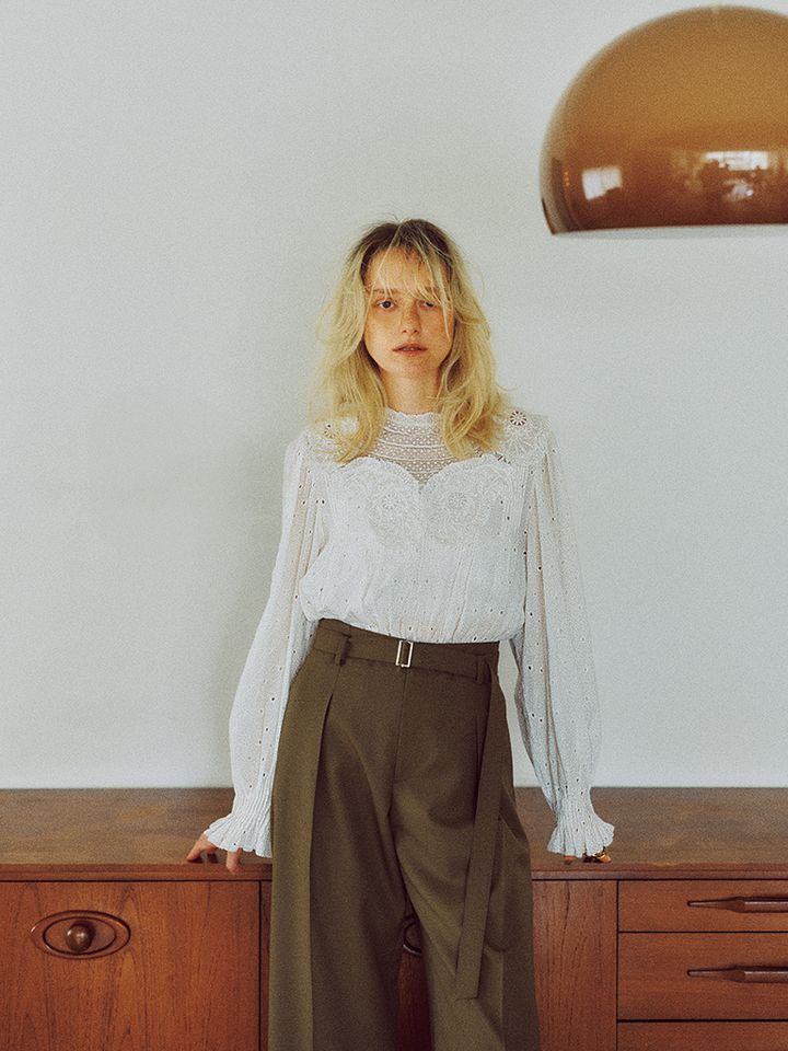 花柄やドットなどの多彩なカットワークがほどこされた、エレガントな1枚。ネックとそでにもフリルがあしらわれ、さらなる甘さをプラス。パンツのベルトは適当にたらしてアンニュイなムードをあと押し。