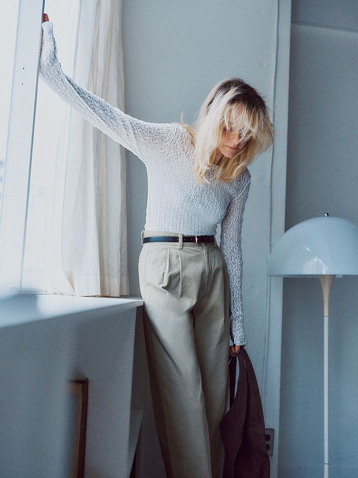 凹凸のあるレースの立体感が、クリアな白に「甘すぎない」表情を刻む。あえて無骨なチノパンを合わせても、この繊細な透け感と質感が、ラフなボトムを瞬時に格上げ。 鍵となるのは、手の甲にまであえてかかる「長めのそで」。このアンニュイなディテールが、何気ない所作を優雅に見せ、指先にまで女っぽさを宿す。