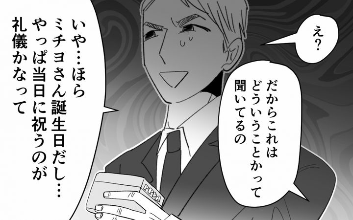 夫は明らかに動揺していましたが、手には母への誕生日プレゼント。母は「子育ての相談に乗っていただけ」と、落ち着いた様子で答えてきたのです。