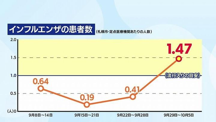 札幌市内の感染状況を示す、一医療機関あたりの患者の数は9月29日からの1週間で、患者の数は流行入りの目安となる「1」を超えて、1.47となりました。