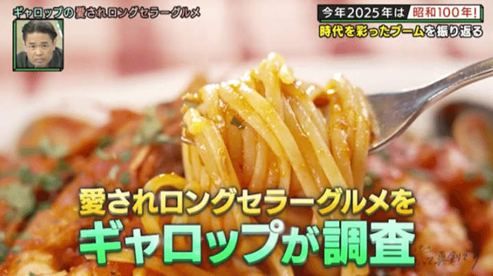 そして、今から62年前の昭和38年、1963年に誕生した日本発祥のパスタメニュー“たらこスパゲッティ”にも注目する。ギャロップがやってきたのは老舗スパゲッティ専門店「壁の穴」の大阪・梅田にあるお店。こちらの東京・渋谷店で生まれたたらこスパゲッティは、日本人の口に合う味を模索するなか、お客さんの海外土産だったというある食べ物をヒントに誕生したらしく…。そんな当時の味を復刻した元祖たらこスパゲッティを堪能! 海外食だったスパゲッティを日本の国民食に押し上げた革新的メニューのお味とは?