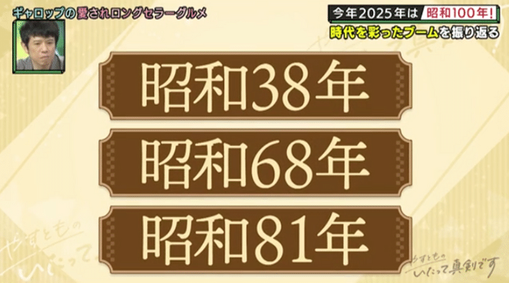 今年は昭和で数えるとちょうど100年にあたる年。100年の間に起こったさまざまな“食のブーム”を紹介しながら、その中で生まれ、今も愛され続けるグルメをギャロップが調査する「ギャロップの昭和100年!愛されロングセラーグルメ」。今回も、3つの年にスポットを当てる。