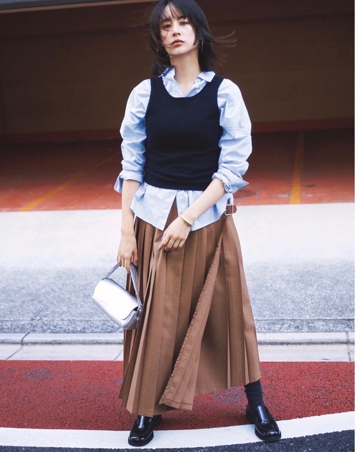 10月30日(木)、夏に活躍していたニットタンクは、定番シャツに重ねて秋ムードにシフト。ブラウンのプリーツスカートを合わせれば、トラッドな上品さが漂います。足元は黒のローファーで引き締めて、きちんと感をプラス。ベーシックなアイテム同士の組み合わせも、配色とシルエットで今っぽく更新してくれます。