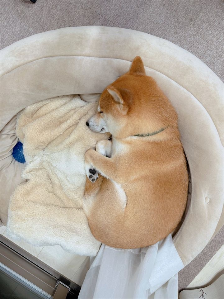 ベッドで眠る柴犬。 丸まり、ぐっすり心地よさそうなその寝姿が話題となっています。